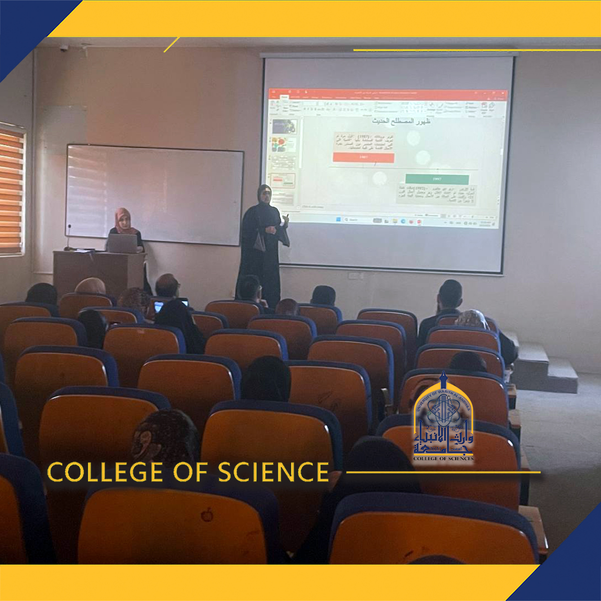 ضمن المحور الثاني للتطوير الاقتصادي للمرأة العراقية، نظّمت وحدة شؤون المرأة في كلية العلوم بجامعة وارث الأنبياء بتاريخ (3/12/2025) ندوة تثقيفية بعنوان "تمكين المرأة العراقية في التنمية الاقتصادية المستدامة"، قدّمها كلٌّ من م.م إيلاف علي صفوك وم.م سجى باسم.