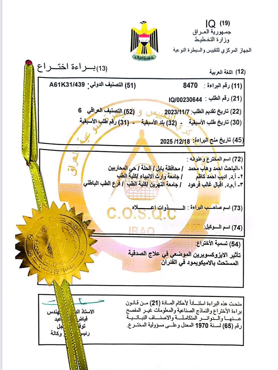 حصل الاستاذ الدكتور أديب أحمد الزبيدي رئيس فرع علم الأدوية في كلية الطب - جامعة وارث الأنبياء على براءة الاختراع الموسومة :