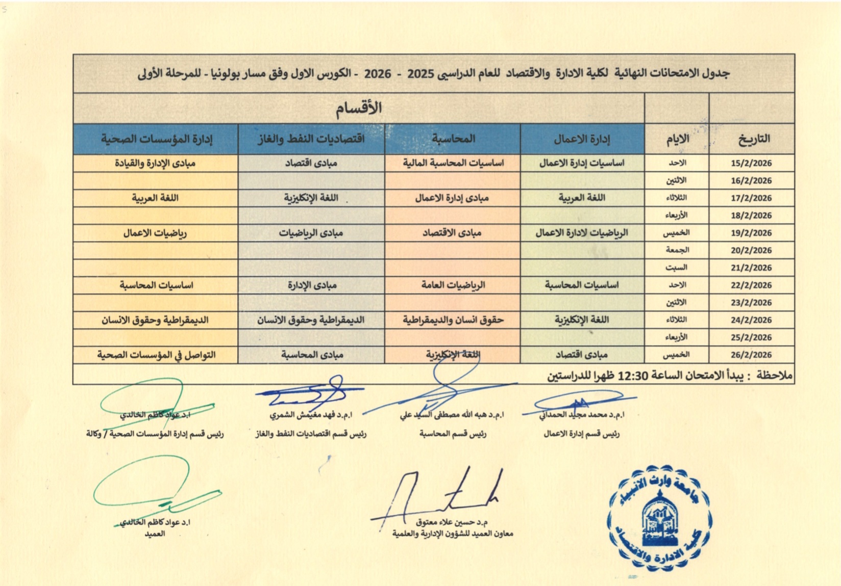 جدول الامتحانات النهائية لكلية الإدارة والاقتصاد للعام الدراسي 2025-2026 الكورس الأول وفق مسار بولونيا- المرحلة الأولى