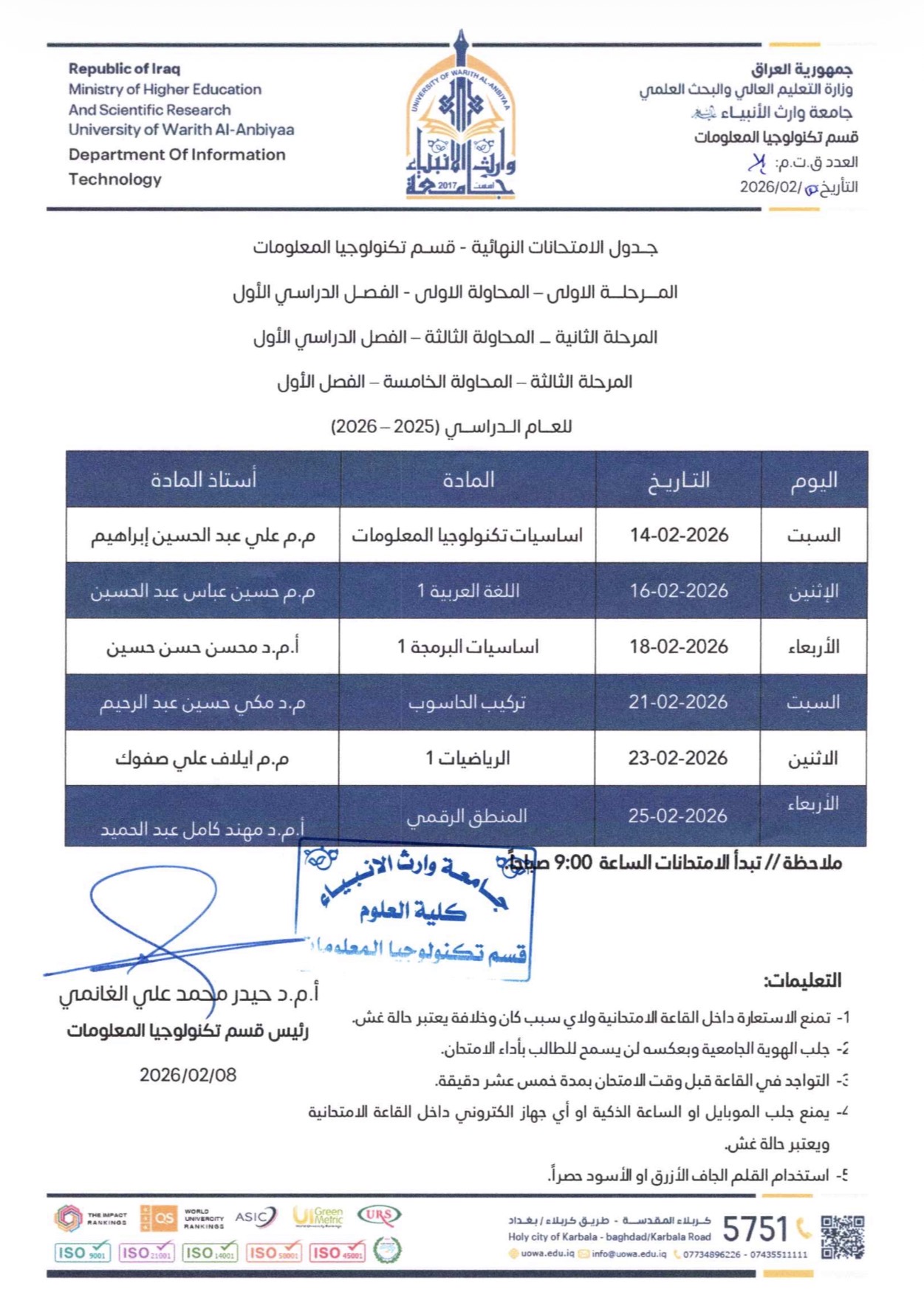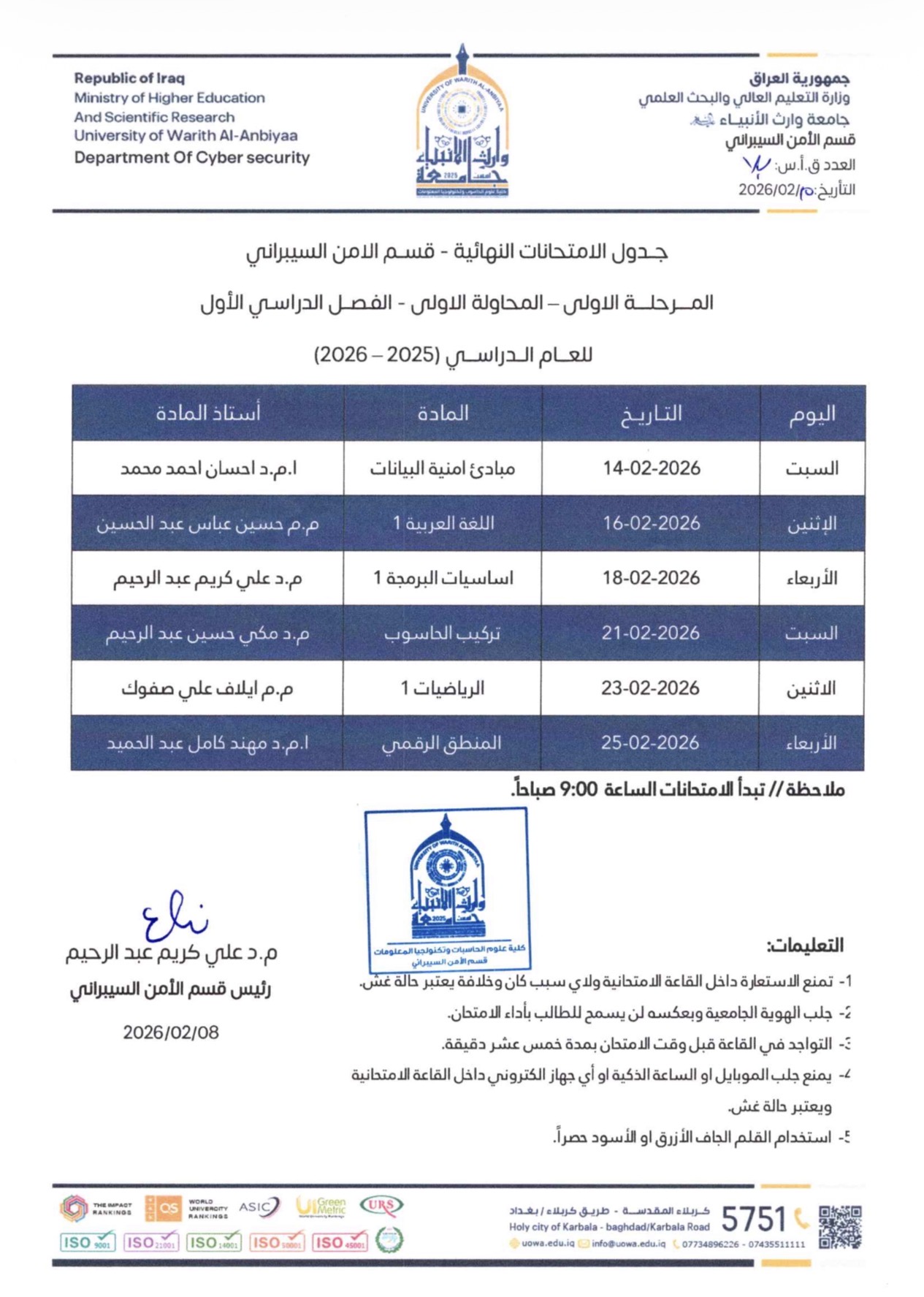 جدول الامتحانات النهائية / المرحلة الاولى - المحاولة الاولى - الفصل الدراسي الاول 2025-2026