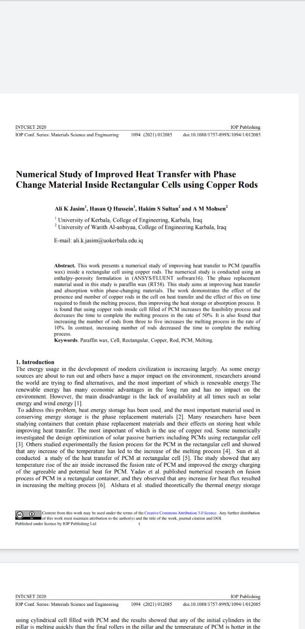 يقدم هذا العمل دراسة عددية لتحسين نقل الحرارة إلى PCM (شمع البارافين) داخل خلية مستطيلة باستخدام قضبان النحاس ، كما تم فحص الدراسة العددية باستخدام برنامج (ANSYS / FLUENT software16). و المادة المستخدمة في تغيير الطور لهذه الدراسة هي شمع البارافين (RT58) ، اذ ان الأهمية العلمية للدراسة وجدت أن استخدام قضبان النحاس داخل الخلية المملوءة بـ PCM (شمع البارافين) يزيد من الجدوى ويقلل من الوقت لإكمال عملية الصهر بنسبة 50٪.