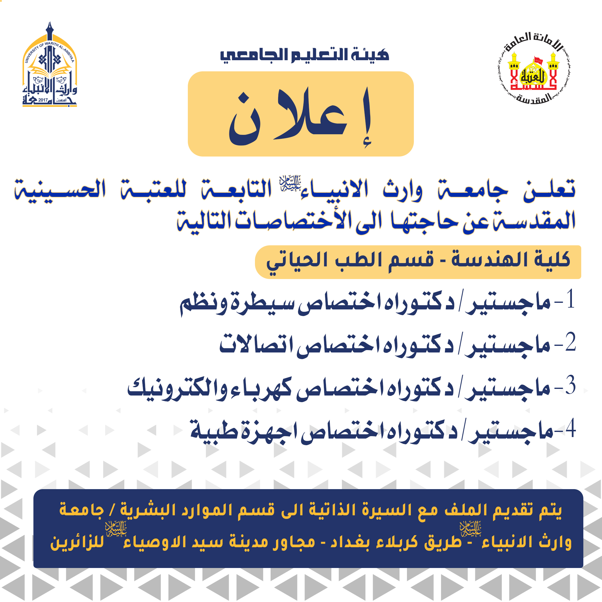 تعلن جامعة وارث الانبياء(عليه السلام) عن حاجتها الى درجات وظيفية ضمن الملاك التدريسي في كلية الهندسة