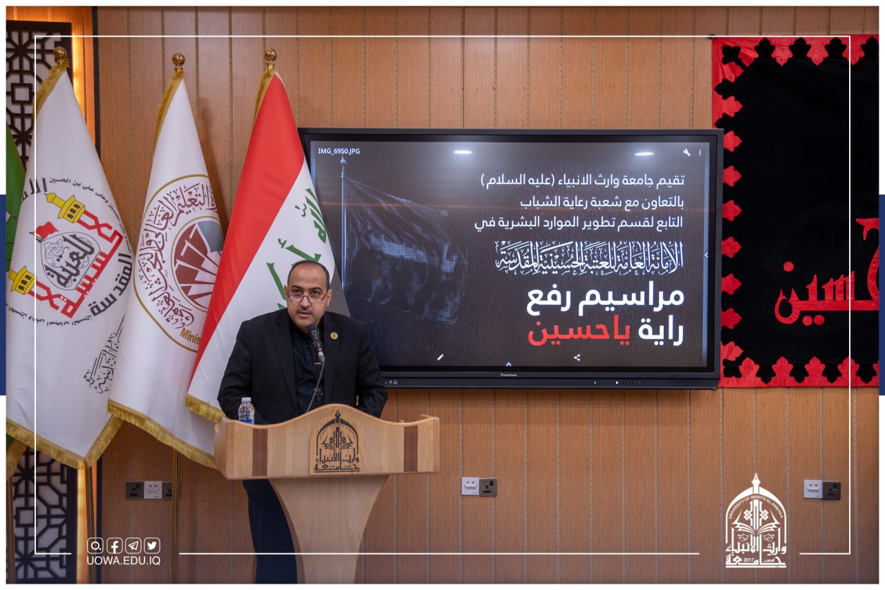 لاحياء هذه المناسبة الأليمة، استشهاد سبط رسول الله (صلى الله عليه واله) وال بيته واصحابه وبهذه المناسبة القى السيد رئيس الجامعة الاستاذ الدكتور ابراهيم الحياوي كلمة اكد من خلالها أن هذا التجمع ليس لمجرد رفع الراية فحسب بل للاعلان عن أننا نجدد الولاية وماضون على طريقكم ونهجكم في التضحية والفداء والبناء، وهذه المناسبة والمراسم هي اشعار بأن هذه الشعائر مقدسة ولابد من اقامتها خاصة من قبل الصروح العلمية وخصوصاً في جامعتنا التي تنتمي الى الإمام الحسين(عليه السلام).
