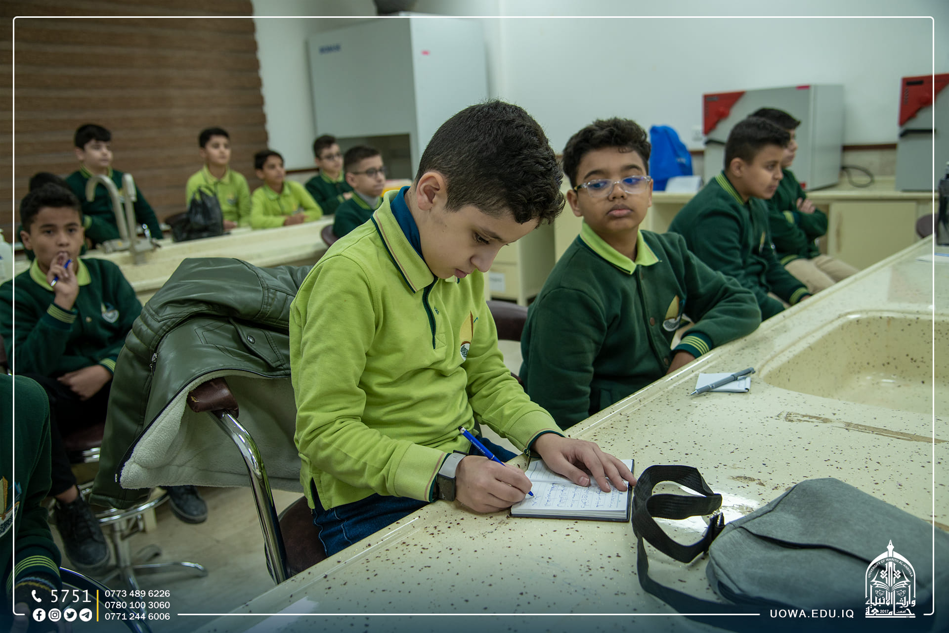 استقبلت جامعة وارث الأنبياء (عليه السلام) عدد من طلبة مرحلة الخامس الابتدائي في مدرسة الق الوارث الابتدائية التابعة للعتبة الحسينية المقدسة، وتجول الطلبة في أروقة الجامعة وكلية التمريض واطلعوا على المختبرات العلمية فيها، وتم تقديم شرح مختصر عن مختبر الكيمياء والتشريح، إذ تساهم هذه الرحلات في تنمية مهارات الطلبة، وفي نهاية السفرة خط الطلبة رسائل شكر الى الجامعة بأناملهم اليافعة، عبروا من خلالها عن التفاصيل الجميل التي شاهدوها في الجامعة بأنامل بريئة .