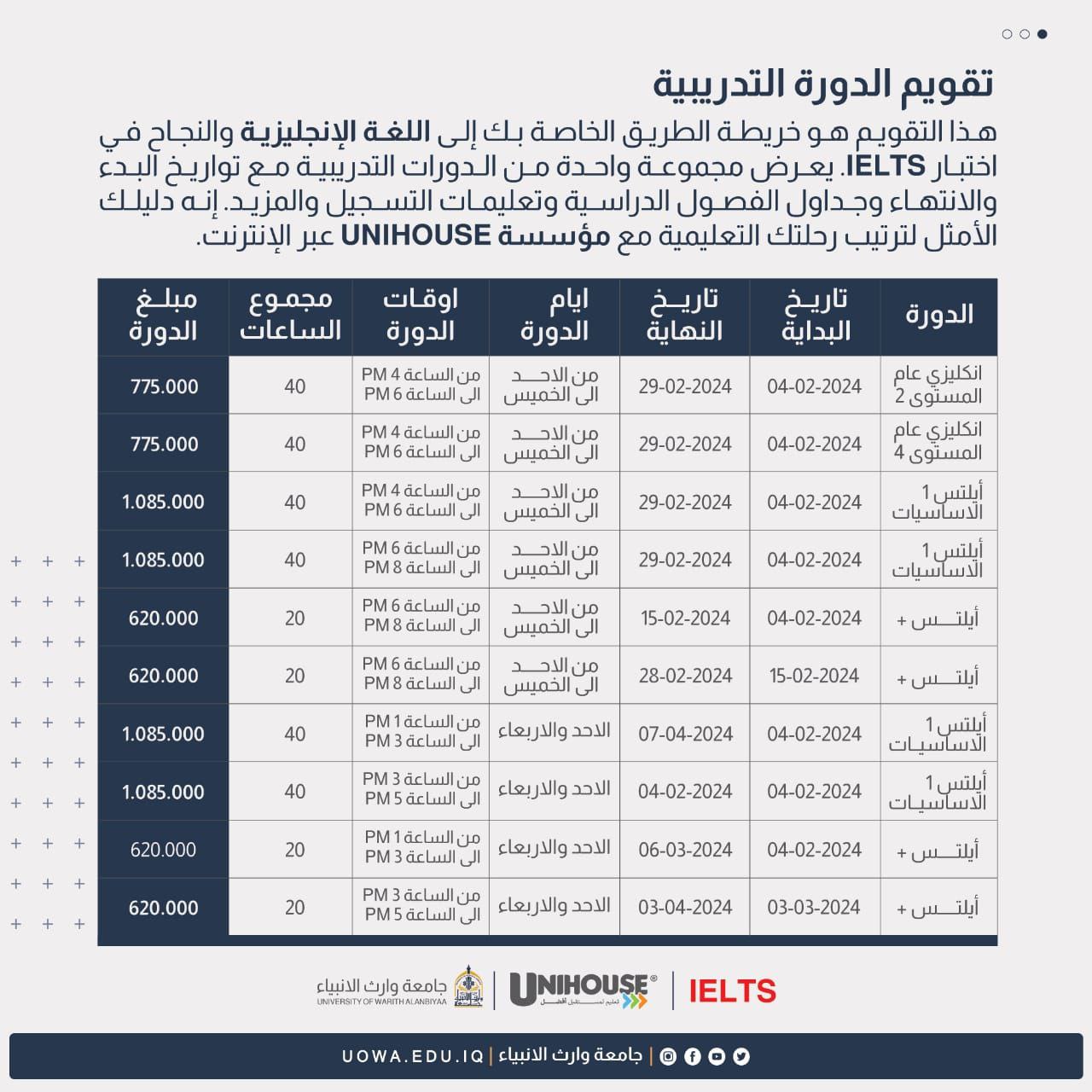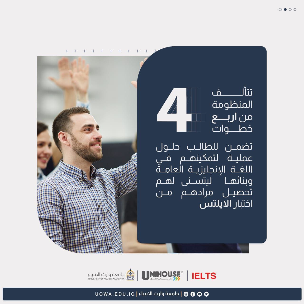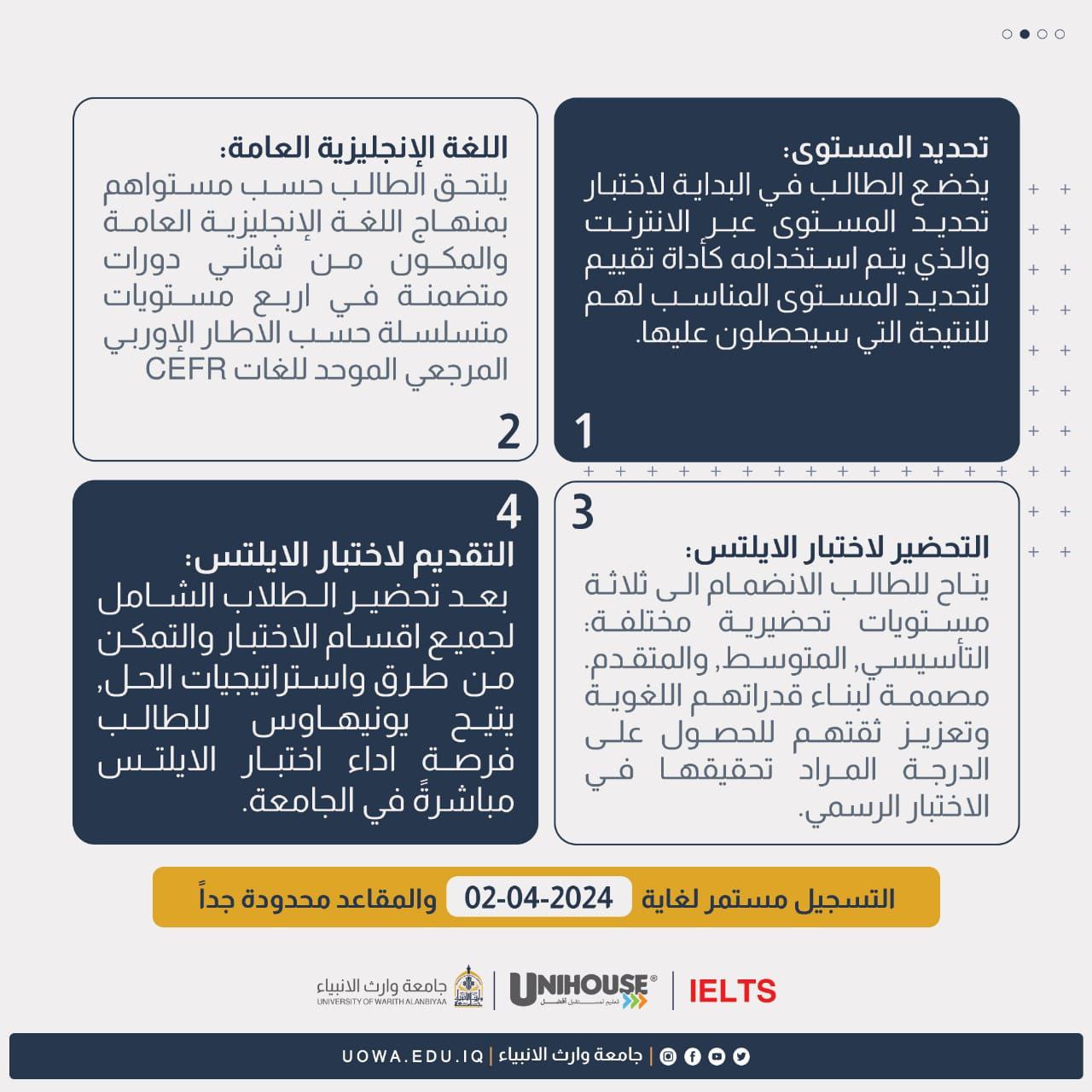 تطُلق جامعة وارث الأنبياء(عليه السلام)، وبالتعاون مع "مؤسسة UniHouse البريطانية" برامجها التدريبية للإستعداد لإختبار IELTS من قبل مدربين محترفين وعالميين معتمدين IELTS الدولية.