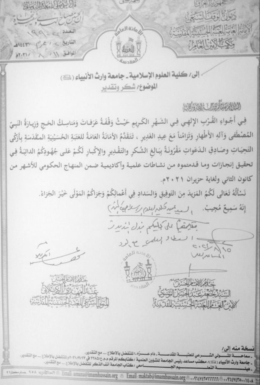 تتقدم جامعة وارث الأنبياء بكتاب شكر وتقدير إلى عمادة كلية العلوم الاسلامية ومنتسبيها على إنجازات الكلية للعام الدراسي ٢٠٢٠ / ٢٠٢١