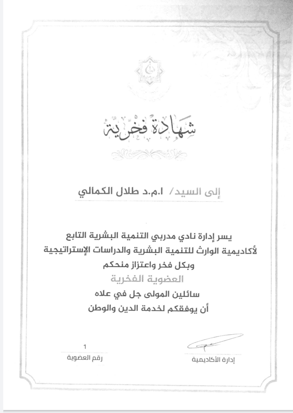 حصل السيد عميد كلية العلوم الإسلامية أ.م.د طلال الكمالي المحترم على العضوية الفخرية الاولى في نادي المدربين التابع لاكاديمية الوارث للتنمية البشرية والدراسات الاستراتيجية في العتبة الحسينية المقدسة...