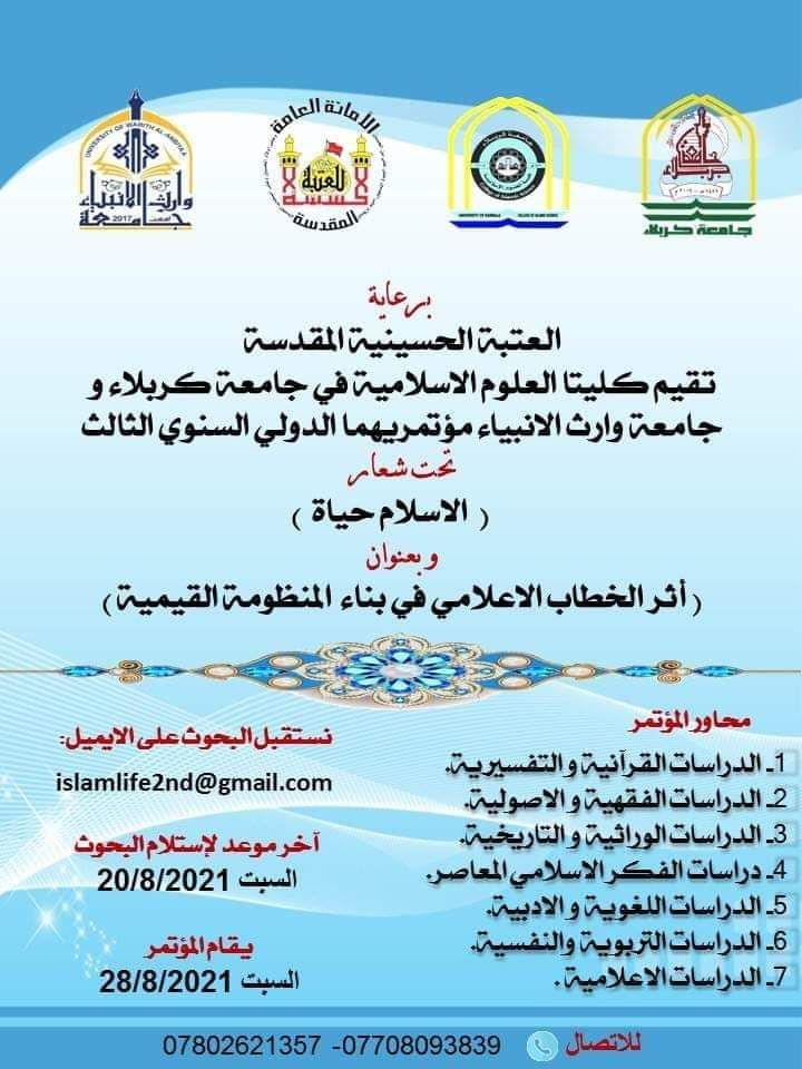 مؤتمر علمي دولي برعاية العتبة الحسينية المقدسة وبالتعاون مع كلية العلوم الاسلامية في جامعة وارث الانبياء