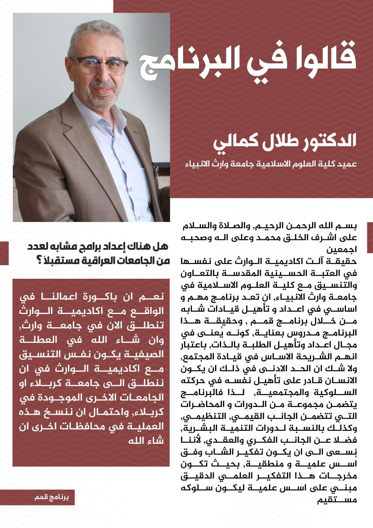 تواصل أكاديمية الوارث للتنمية البشرية والدراسات الاستراتيجية وكلية العلوم الاسلامية في جامعة وارث الانبياء عليه السلام فعاليات البرنامج التدريبي القيادي قمم والذي يستهدف طلبة الجامعات.استمر ا. م. د. طلال الكمالي عميد كلية العلوم الاسلامية واستاذ مادة الأخلاق في قيادة درسه ضمن المحور الخاص بالبرنامج.ضم البرنامج إحدى المحاور التدريبية الجديدة فن اتخاذ القرار وكان من نصيب المدربة المعتمدة هدى النصراوي، وضمنت محاورها مفهوم وأساسيات وخطوات اتخاذ القرار.