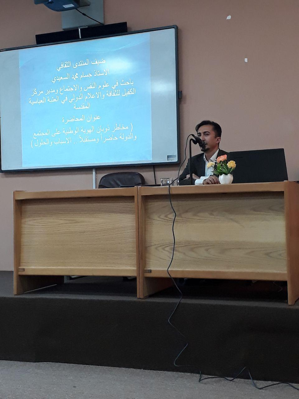 القى الاستاذ جسام محمد السعيدي باحث في علوم النفس والاجتماع ومدير مركز الكفيل للثقافة والاعلام في العتبة العباسية المقدسة محاضرته الموسومة ( مخاطر ذوبان الهوية الوطنية على المجتمع والدولة حاضراً ومستقبلاً .. الاسباب والحلول) في المنتدى الثقافي الاسبوعي المقام برعاية كلية العلوم الاسلامية / جامعة وارث الانبياء يوم الاثنين الموافق 8/4/2019 تناول فيها كيفية الحفاظ على الهوية الوطنية من التيارات الدخيلة وخشية انطماسها .