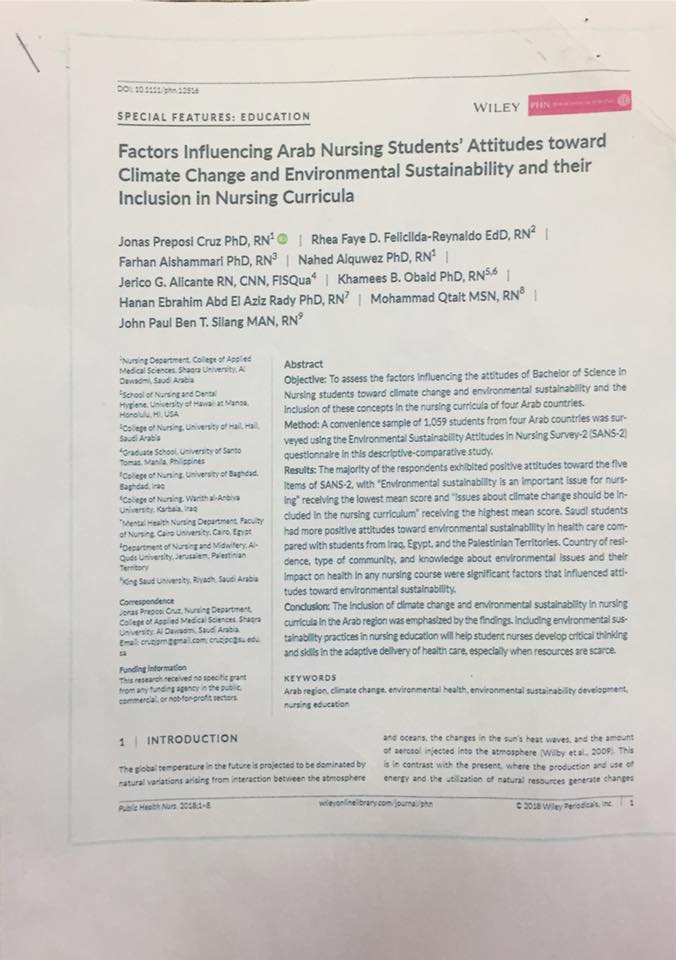 نشر الباحث والأكاديمي عميد كلية التمريض ا.م.د خميس بندر عبيد بحث علمي بعنوان (العوامل المؤثرة في اتجاهات طلاب التمريض العرب نحو تغير المناخ والاستدامة البيئية وتضمينها في مناهج التمريض) وهي دراسه اُجريت في عدد من الدول العربية الهدف منها هو لتقييم العوامل المؤثرة في اتجاهات طلاب التمريض نحو تغير المناخ والاستدامة البيئية وإدراج هذه المفاهيم في مناهج التمريض في أربع دول عربية. حيث اجريت في اربع دول عربية هي (العراق والسعودية ومصر وفلسطين ) وبمشاركة مجموعة من الباحثين من دول عربية واجنبية وقد اظهرت نتائج هذه الدراسة ان الطلاب السعوديين لديهم اتجاهات أكثر إيجابية تجاه الاستدامة البيئية في الرعاية الصحية مقارنة مع الطلاب من العراق ومصر والأراضي الفلسطينية. وكان البلد ونوع المجتمع والمعرفة حول القضايا البيئية وتأثيرها على الصحة في أي دورة للتمريض من العوامل الهامة التي أثرت على المواقف تجاه الاستدامة البيئية.