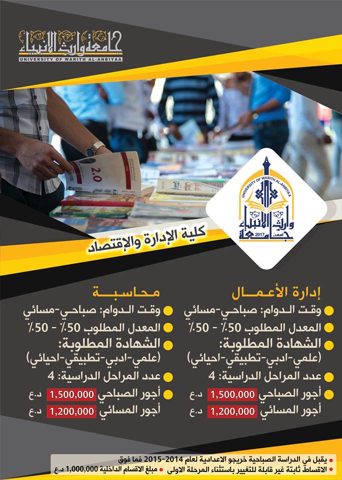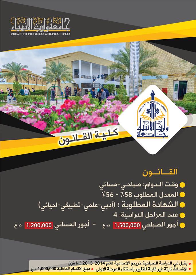 كلية التمريض في جامعة وارث الانبياء: تقبل هذه الكلية خريجوا الدراسة الاعدادية ( العلمي ، الاحيائي) واعدادية التمريض والقبالة وباجور دراسية 2,800,000 تسدد على ثلاث دفعات علما ان الحد الادنى لمعدل القبول هو 60٪؜