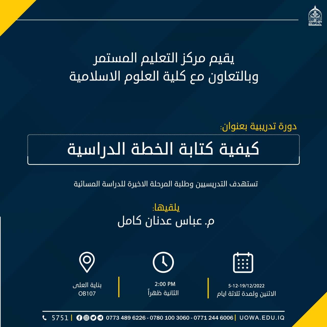 تستهدف الدورة العلمية شريحة التدريسين وموظفين الجامعة يحاضر فيها كل من المدرس الدكتور مصطفى جعفر الابراهيمي والمدرس الدكتور زين العابدين حميد كمال الدين على قاعة (٢٠٩) في بناية العلى في تمام الساعة الثانية عشر والنصف ولمدة ثلاثة أيام ابتداءاً من يوم وسيمنح الحاضرين شهادة حضور معتمدة .
