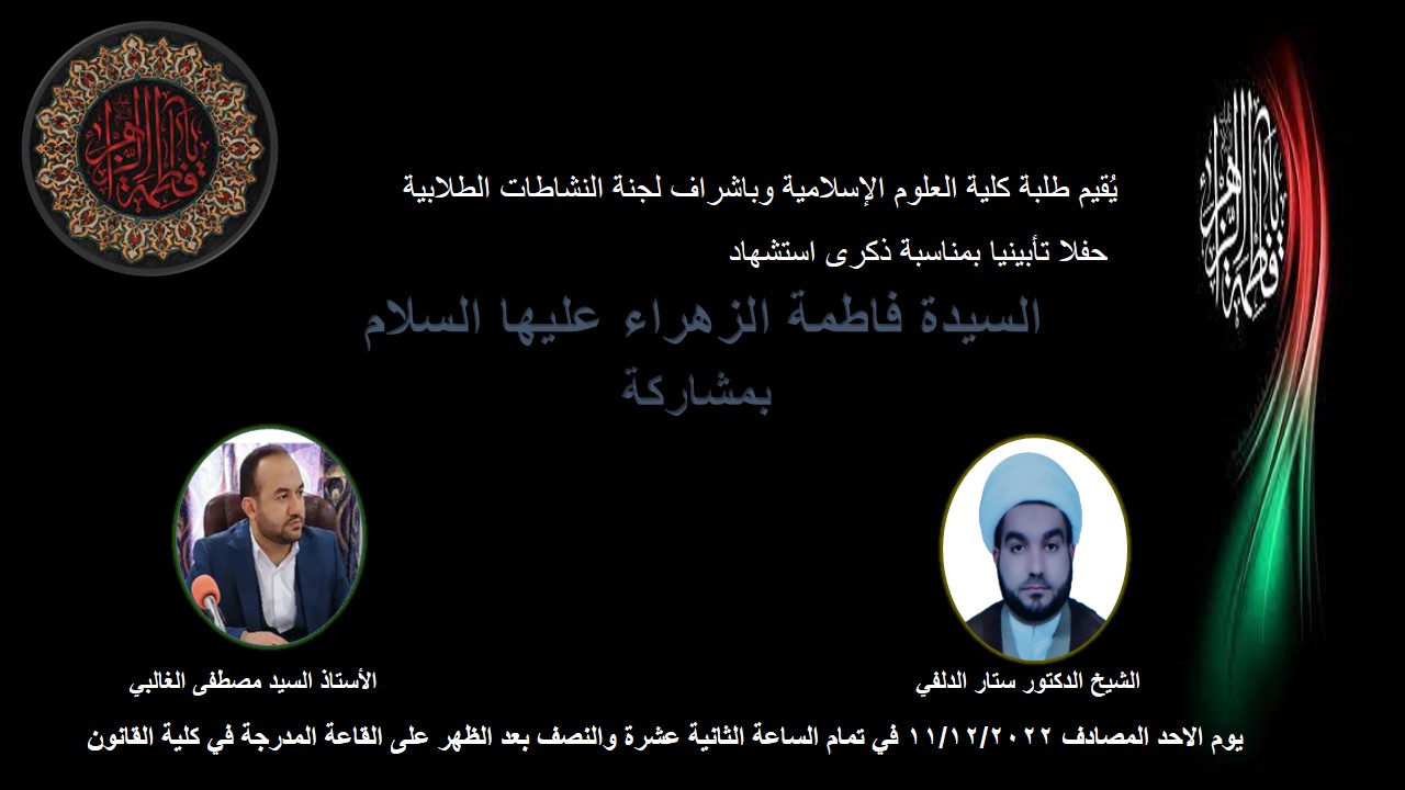 برعاية السيد عميد كلية العلوم الاسلامية الاستاذ المساعد الدكتور طلال فائق الكمالي  أقامت  لجنة النشاطات الطلابية حفلاً تأبينياً بذكرى استشهاد بنت خير المرسلين الصديقة الطاهرة السيدة فاطمة الزهراء (عليها السلام) حضر المجلس عميد الكلية ورؤساء الأقسام العلمية والتدريسيين والطلبة في يوم  الأحد الموافق ١١/١٢/٢٠٢٢حيث ارتقى المنبر سماحة الشيخ الدكتور ستار الدلفي  مستذكراً المواقف والأدوار التي قامت بها الزهراء (عليها السلام) في عهد النبوة والإمامة وكيف رسمت لنا ملامح الدفاع عن الإمامة كمنصب إلهي يعتبر استمرارا لمنصب النبوة .ثم موشحات دينية  في رثاء السيدة فاطمة الزهراء عليها السلام ألقاها المدرس المساعد مصطفى الغالبي مع لمسات طلابية مرافقة لها علماً ان الحفل التأبيني ضمن برامج   كلية العلوم الاسلامية التي تهدف لإحياء ذكرى أهل البيت (عليهم السلام) ولبيان الدور الذي لعبه المعصومين في بناء مجتمع إسلامي متكامل.