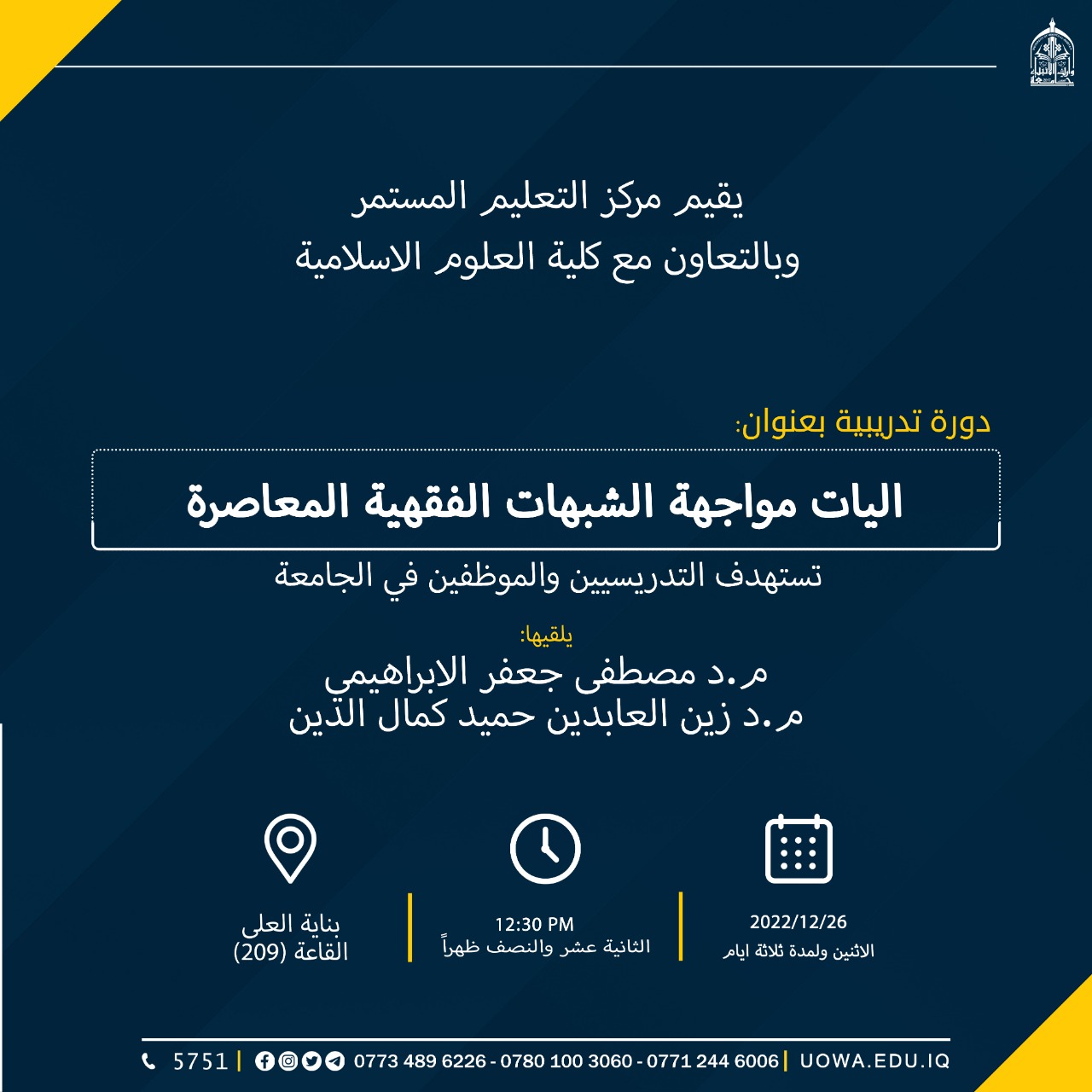 يقيم مركز التعليم المستمر في جامعة وارث الانبياء ع بالتعاون مع كلية العلوم الاسلامية دورة علمية  تحت عنوان: (آليات مواجهة الشبهات الفقهية المعاصرة)