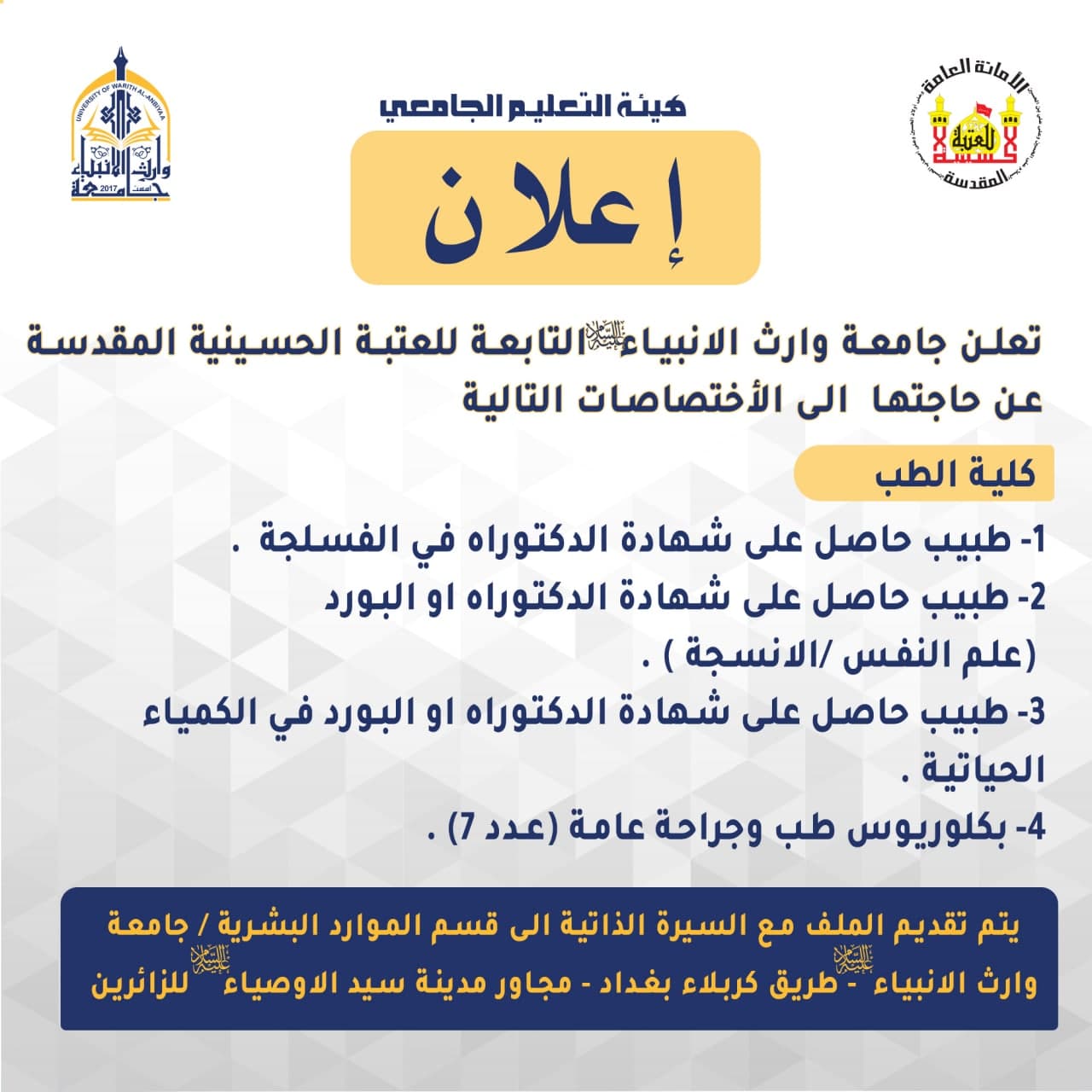 تعلن جامعة وارث الانبياء(عليه السلام) عن حاجتها الى الاختصاصات التالية في كلية الطب