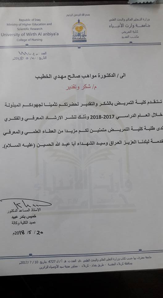 وجه الاستاذ الدكتور طالب حسن موسى /رئيس جامعة وارث الانبياء كتاب شكر وتقدير الى الأستاذ المساعد الدكتور خميس بندر عبيد السعيدي /عميد كلية التمريض/جامعة وارث الانبياء وذلك لنشرة بحثين علميين في مجلة عالمية ويعد هذا العمل حلقة انجاز تضاف الى انجازات الكلية والجامعة على الصعيد العالمي في نشر البحوث.