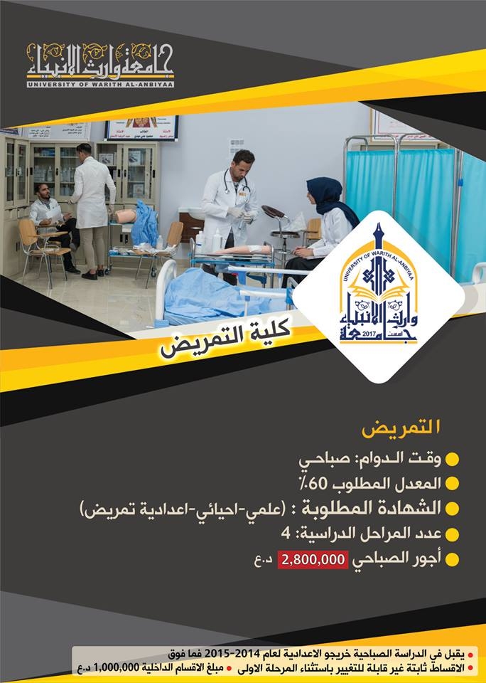 كلية التمريض في جامعة وارث الانبياء: تقبل هذه الكلية خريجوا الدراسة الاعدادية ( العلمي ، الاحيائي) واعدادية التمريض والقبالة وباجور دراسية 2,800,000 تسدد على ثلاث دفعات علما ان الحد الادنى لمعدل القبول هو 60٪