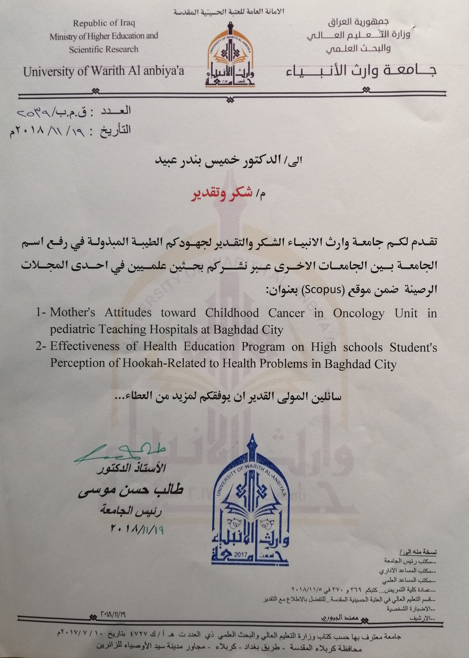 كلية التمريض/جامعة وارث الانبياء ع تشارك في المؤتمر العالمي الأول للعلوم الطبية حيث حضر المؤتمر وفد يمثل كلية التمريض على فعاليات المؤتمر العالمي الأول للعلوم الطبية الذي اقامتة جامعة العميد متمثلا بالاستاذ المساعد الدكتور خميس بندر عبيد السعيدي/عميد كلية التمريض والاستاذ احمد محمد جاسم/تدريسي في كلية التمريض ووفد من رئاسة جامعة وارث الانبياء ع .