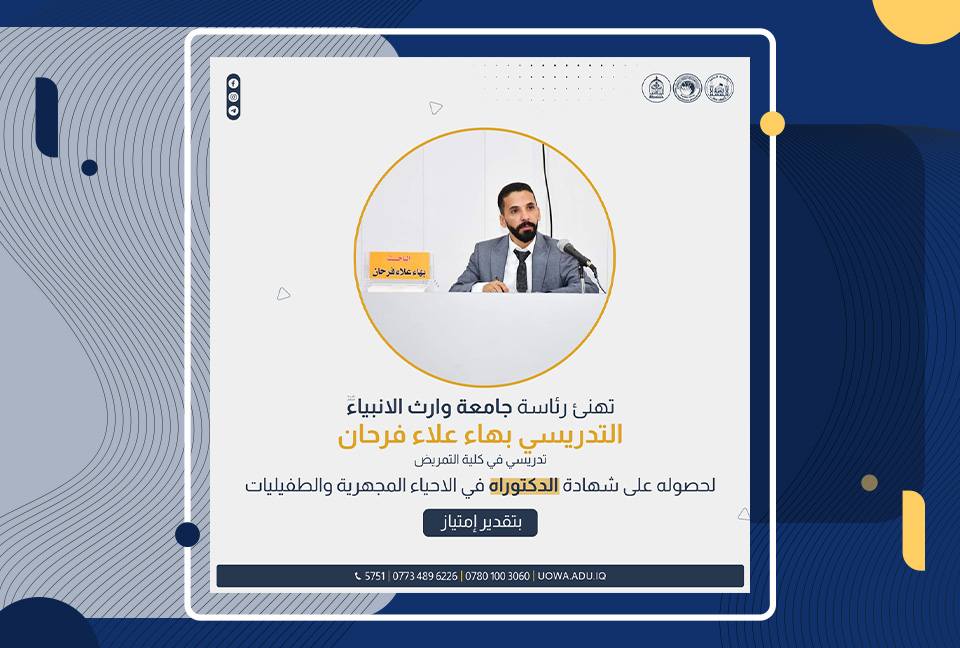 تتقدم رئاسة جامعة وارث الأنبياء وعمادة كلية التمريض بأحر التهاني والتبريكات للتدريسي بهاء علاء فرحان بمناسبة مناقشة أطروحته وحصوله على شهادة الدكتوراه في تخصص الأحياء المجهرية والطفيليات، بتقدير امتياز. نتمنى له التوفيق والسداد في مسيرته الأكاديمية.