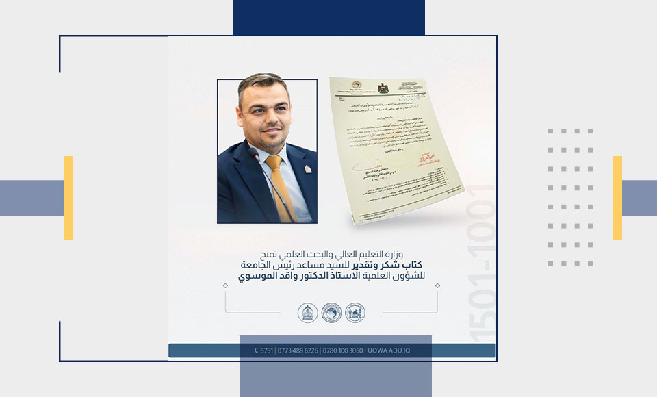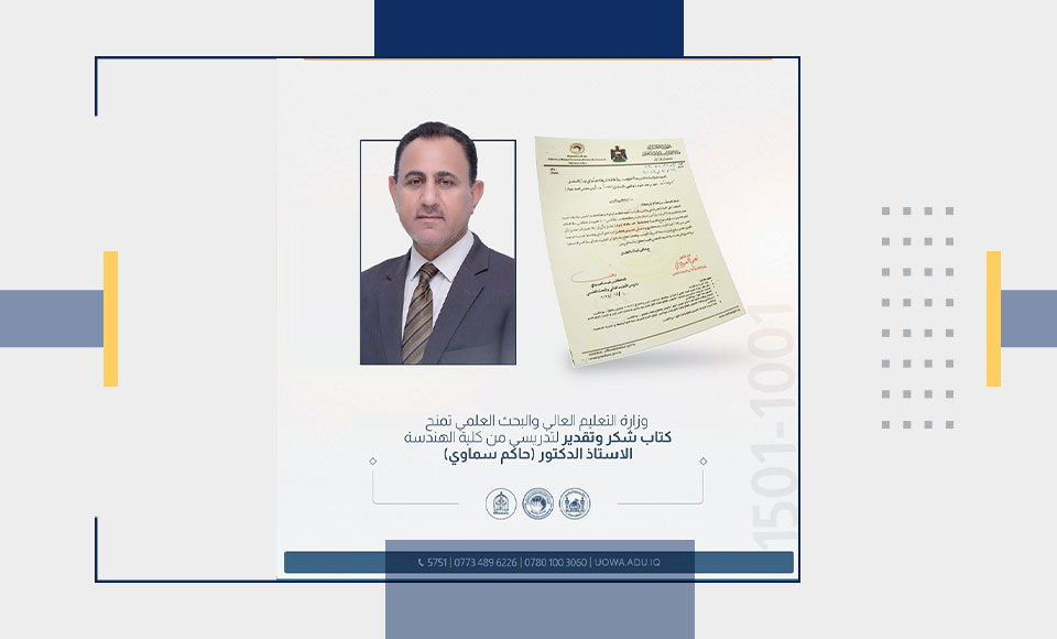 في إطار تقديره للجهود الأكاديمية، منح معالي وزير التعليم العالي والبحث العلمي، الدكتور نعيم العبودي، كتاب شكر وتقدير للأستاذ الدكتور حاكم سماوي، التدريسي في كلية الهندسة بجامعة وارث الأنبياء (عليه السلام).