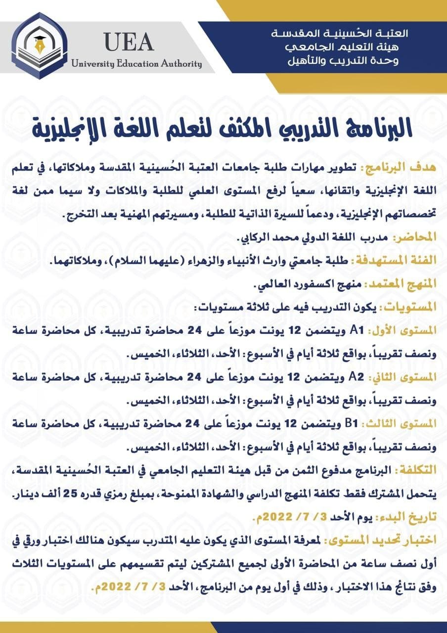 أطلقت هيئةُ التعليم الجامعي في العتبة الحسينية المقدسة برنامجها الأول لتعلم اللغة الانجليزية بمستوياتِها كافة، مستهدفةً بذلك رفع مستوى الكفاءةِ لطلبةِ جامعتي وارث الانبياء والزهراء (عليهما السلام)، علمًا أن البرنامجَ ممولاً ومدعومًا بالكاملِ من الهيئةِ ويشملُ الطلبةَ والملاكاتَ العلميةَ والادارية كما نود إعلامكم ان التسجيل ودفع رسوم الاشتراك يكون في مقر هيئة التعليم الجامعي داخل جامعة وارث الأنبياء (عليه السلام).