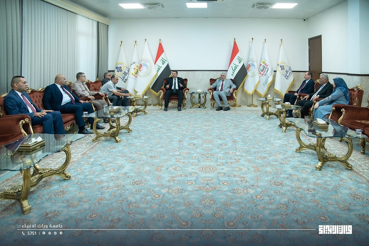 Within the framework of academic openness and strengthening cooperation between educational institutions, the President of Warith Al-Anbiya University, Professor Dr. Ibrahim Saeed Al-Hayawi, and the Dean of the College of Medicine, Professor Dr. Ali Abdul Saadoun, received a delegation from Hammurabi College of Medicine – University of Babylon, headed by the Dean of the College, Professor Dr. Hadi Al-Moussawi, in an official scientific visit during which a joint cooperation agreement was signed between the two sides. The agreement aims to develop the fields of medical education, scientific research, clinical training, and the exchange of academic expertise between the two colleges, thereby contributing to raising the level of medical education in Iraq and providing an integrated scientific environment that supports innovation and research.