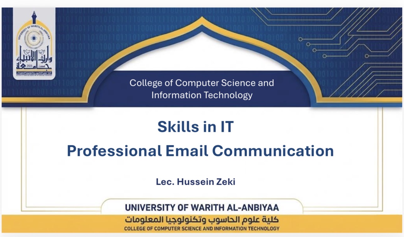 The workshop was presented by Lecturer Hussein Zaki Al-Mankoushi, with the participation of students from the Department of Cybersecurity and the Department of Artificial Intelligence. It aimed to develop students’ email communication skills and enhance their academic and professional correspondence.