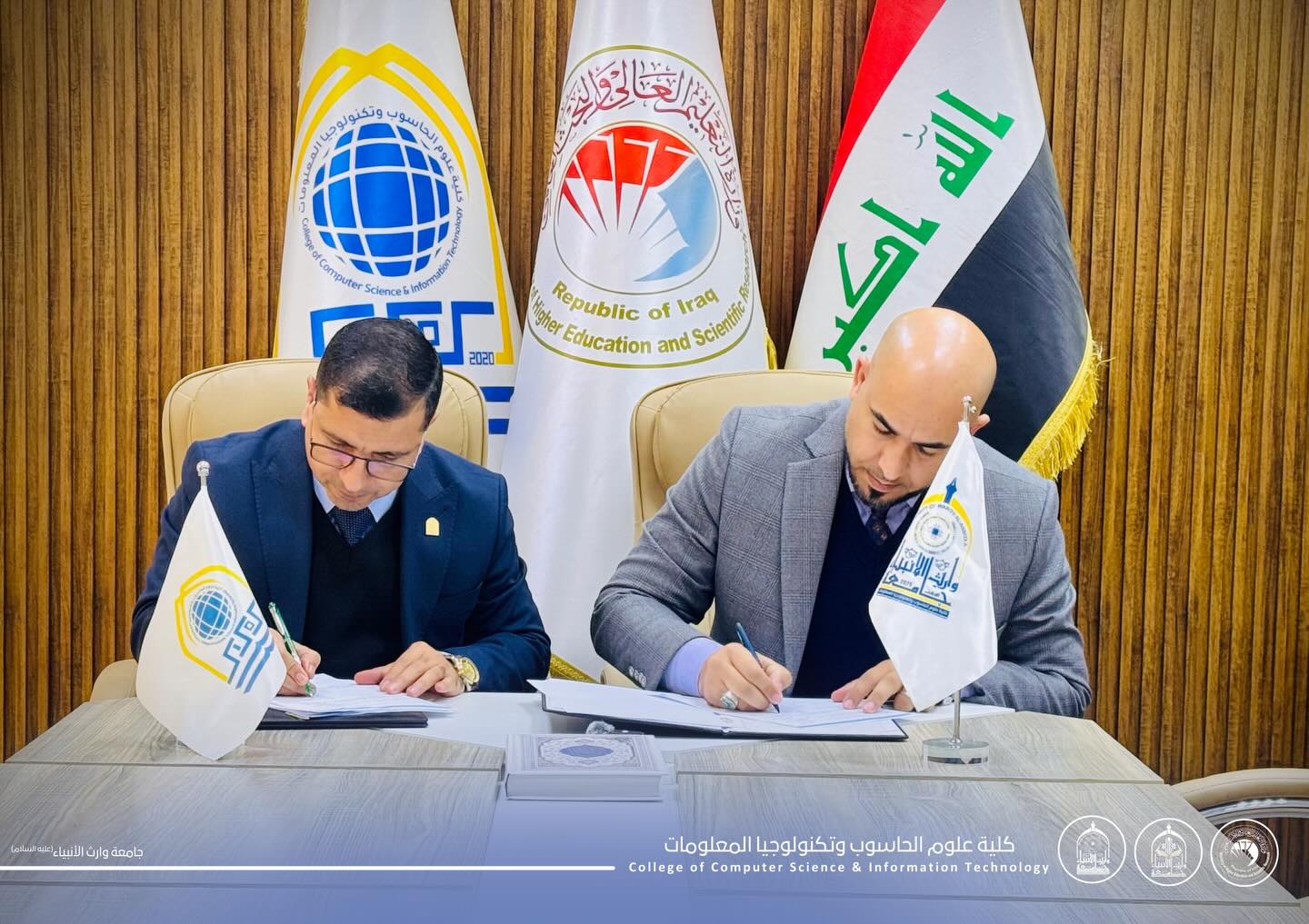 As part of strengthening academic cooperation and exchanging scientific expertise, Assistant Professor Dr. Haider Mohammed Ali Al-Ghanami, Dean of the College of Computer Science and Information Technology at Warith Al-Anbiyaa University (peace be upon him), signed a scientific twinning agreement with Assistant Professor Dr. Mowaffaq Kazem Al-Hasnawi, Dean of the College of Computer Science and Information Technology at the University of Karbala.